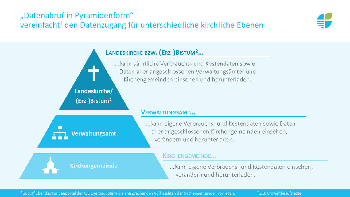 Sie erhalten Zugriff auf ihre eigenen Verbrauchs- und Kostendaten sowie auf die Daten der ihnen zugeordneten Kirchengemeinden – ebenfalls mit Lese-, Änderungs- und Downloadrechten. - Landeskirchen bzw. (Erz-)Bistümer